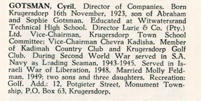GOTSMAN, Cyril. Director of Companies. Born Krugersdorp 16th November, 1923, son of Abraham and Sophie Gotsman. Educated at Witwatersrand Technical High School. Director Lurie & Co. (Pty.) Ltd. Vice-Chairman, Krugersdorp Town School Committee; Vice-Chairman Chevra Kadisha. Member of Kadimah Country Club and Krugersdorp Golf Club. During Second World War served in S.A. Navy as Leading Seaman, 1943-1945. Served in Israeli War of Liberation, 1948. Married Molly Feldman, 1949; two sons and three daughters. Recreation: Golf. Add.: 12, Potgieter Street, Monument Township, P.O. Box 63, Krugersdorp.