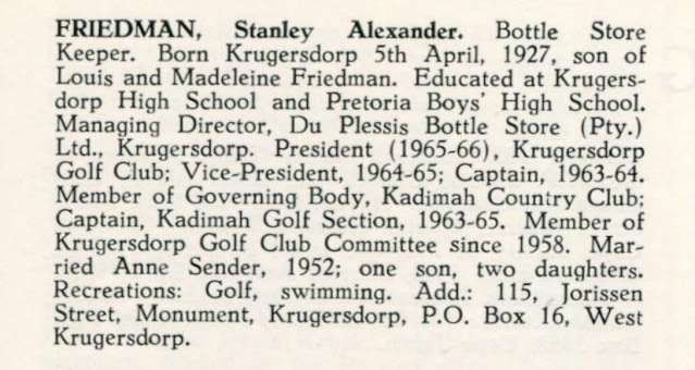 FRIEDMAN, Stanley Alexander. Bottle Store Keeper. Born Krugersdorp 5th April, 1927, son of Louis and Madeleine Friedman. Educated at Krugersdorp High School and Pretoria Boys' High School. Managing Director, Du Plessis Bottle Store (Pty.) Ltd., Krugersdorp. President (1965-66), Krugersdorp Golf Club; Vice-President, 1964-65; Captain, 1963-64. Member of Governing Body, Kadimah Country Club; Captain, Kadimah Golf Section, 1963-65. Member of Krugersdorp Golf Club Committee since 1958. Married Anne Sender, 1952; one son, two daughters. Recreations: Golf, swimming. Add.: 115, Jorissen Street, Monument, Krugersdorp, P.O. Box 16, West Krugersdorp.